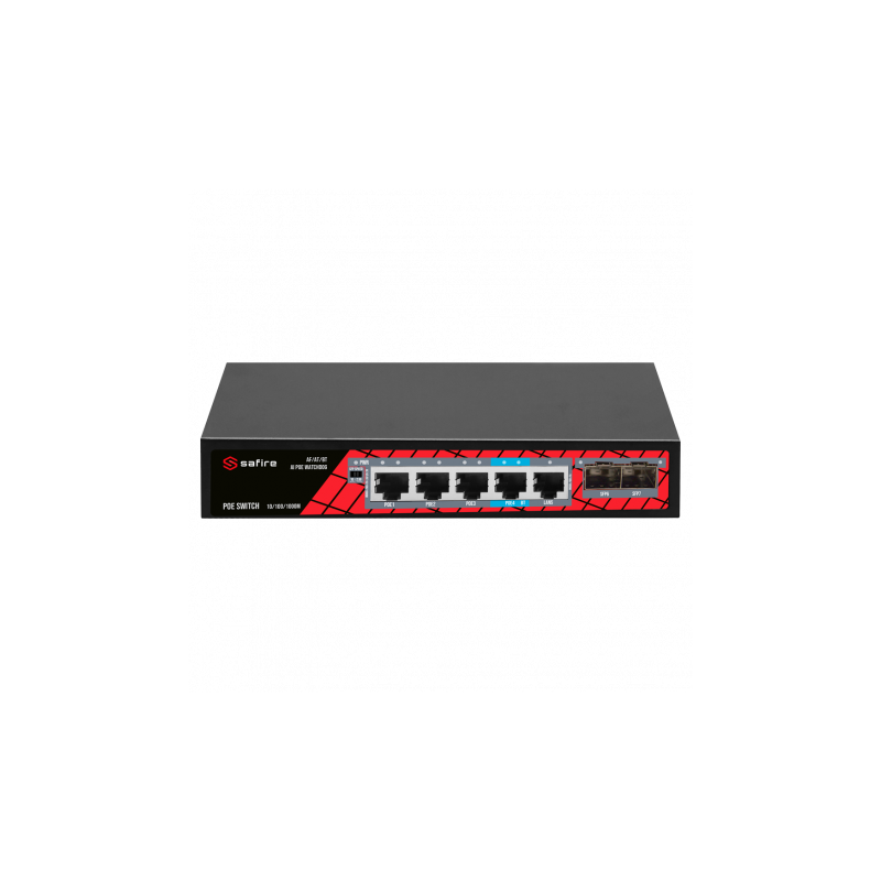 Switch PoE Safire para sobremesa. Incluye 4 puertos PoE RJ45, 1 puerto Uplink RJ45, 2 puertos SFP con velocidades de 1G y 2,5G. Funciona a 10, 100 y 1000 Mbps, suministra hasta 30W por puerto PoE en los puertos 1 a 3, el puerto 4 soporta hasta 60W, con una potencia total de PoE de 65W. Cuenta con PoE Watchdog, función Auto PoE Extendido hasta 130 metros a 10 Mbps, sin necesidad de configuración manual, detectando automáticamente la distancia del cableado.
