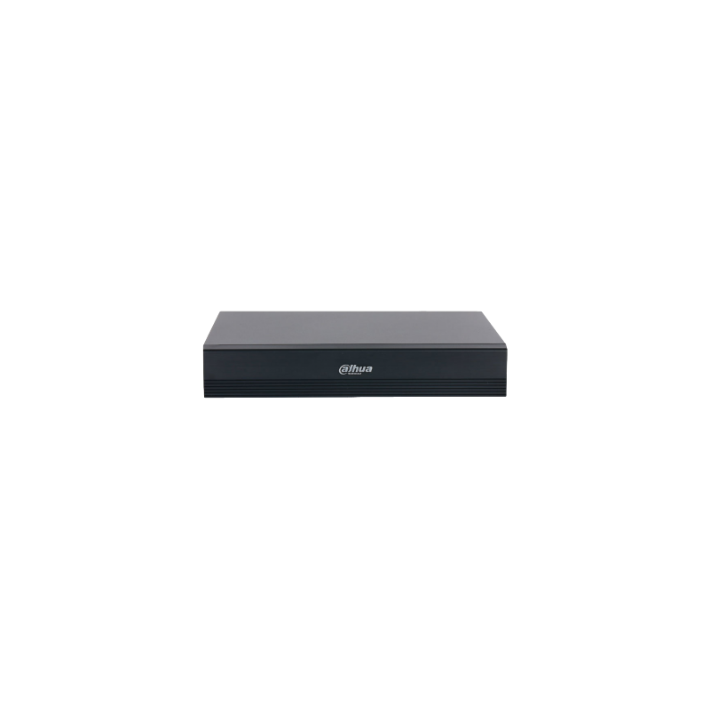 XVR 5 en 1 Dahua con 16 canales BNC y compatibilidad con 8 canales IP adicionales, grabación de hasta 5 megapíxeles a 25 imágenes por segundo, ancho de banda de hasta 128 Mbps, salidas HDMI en resolución 4K y VGA en 1080P, funciones de audio bidireccional y comunicación por coaxial, SMD Plus accesible desde el grabador y cámara, modo Dual Light, máscara negra irregular, capacidad para un disco duro, puerto RJ45 Gigabit y dos puertos USB. Alimentación de 12 VDC.